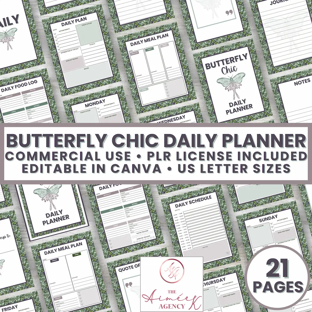 A 21-page daily planner featuring planning, scheduling, and meal tracking pages. This planner is the daily planning portion of the full 67-page Butterfly Chic Planner and comes with PLR, allowing you to edit, brand, and resell with Personal Use Rights.